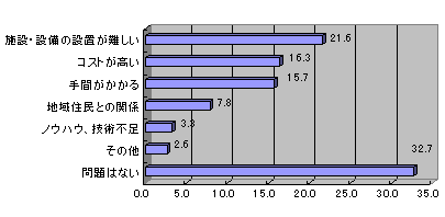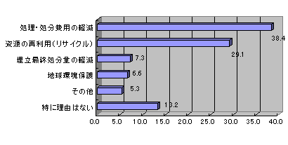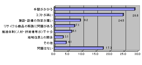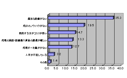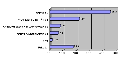 図8−1は「自社または他社と共同で処理している場合、その方法により処理している理由」を、図8−2はその場合の問題点を表している。まず、理由であるが「処理・処分費用の軽減」が最も多く、次いで「資源の再利用」であり、「埋立最終処分量の軽減」、「地球環境保護」という非実利的理由のものとなっている。次に、この場合の問題点であるが、「施設・設備の設置が難しい」、「コストが高い」、「手間がかかる」の順になっているが、「問題はない」が最多である。