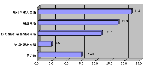 図11は産業廃棄物の減量化、再資源化(リサイクル)への取り組み状況を表している。「既に取り組んでいる」と「現在は取り組んでいないが計画はある」がほぼ同数で、その合計は64.3%である。反面、「現在も取り組んでいないし、その予定もない」が16.0%ある。これを小分類業種でみれば、「既に取り組んでいる」の割合が多い順に、鉄鋼、印刷・製本、食料品、一般機械、金属製品であり、いずれも全業種平均を10ポイント以上超えている。反対に「現在も取り組んでいないし…」が多いものは、木材・木製品、繊維である。さらにこれを従業員数規模別にみると、「既に…」と「現在は…」の割合の合計は、「容器包装リサイクル法」の認知度と同様に従業員数規模が大きくなるに従って多くなる傾向にあり、51〜100人では63.4%、101〜300人では76.1%、300人超では100%である。