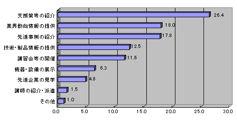 図13は「環境」に関して国、県及び当センター等に希望・期待する事項を取りまとめたものである。これによると、「支援策等の紹介」、「業界動向情報の提供」、「先進事例の紹介」、「技術・製品情報の提供」、「講習会等の開催」が上位の5項目となっている。
